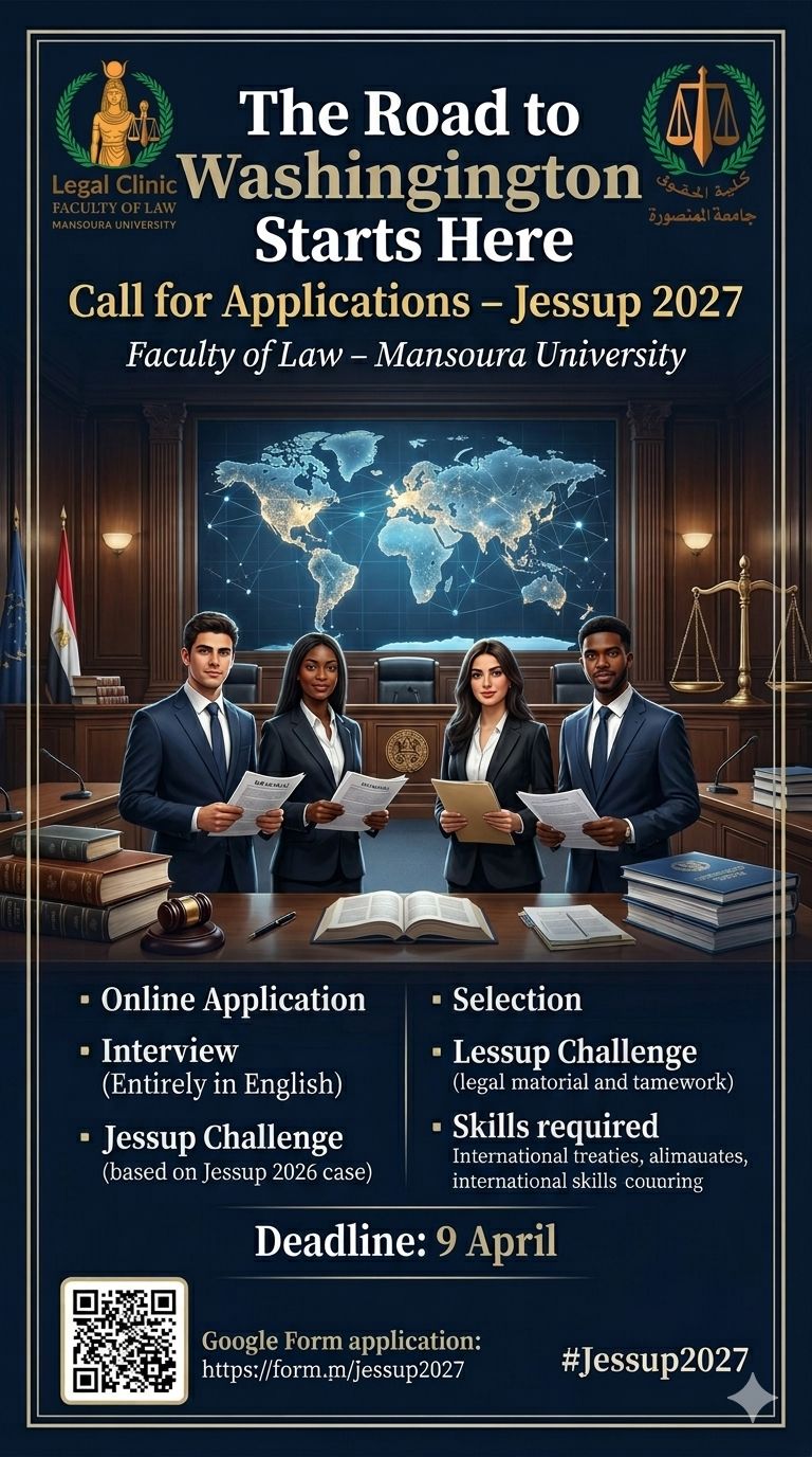 تُعلن كلية الحقوق – جامعة المنصورة عن فتح باب التقديم لاختيار الفريق الممثل للكلية في 2027 Philip C. Jessup International Law Moot Court Competition إذا كنت تمتلك مهارات البحث القانوني، والقدرة على المرافعة باللغة الإنجليزية، وشغفًا حقيقيًا بالقانون الدولي العام، فهذه فرصتك للانضمام إلى أحد أقوى فرق المحاكمات الصورية الدولية.