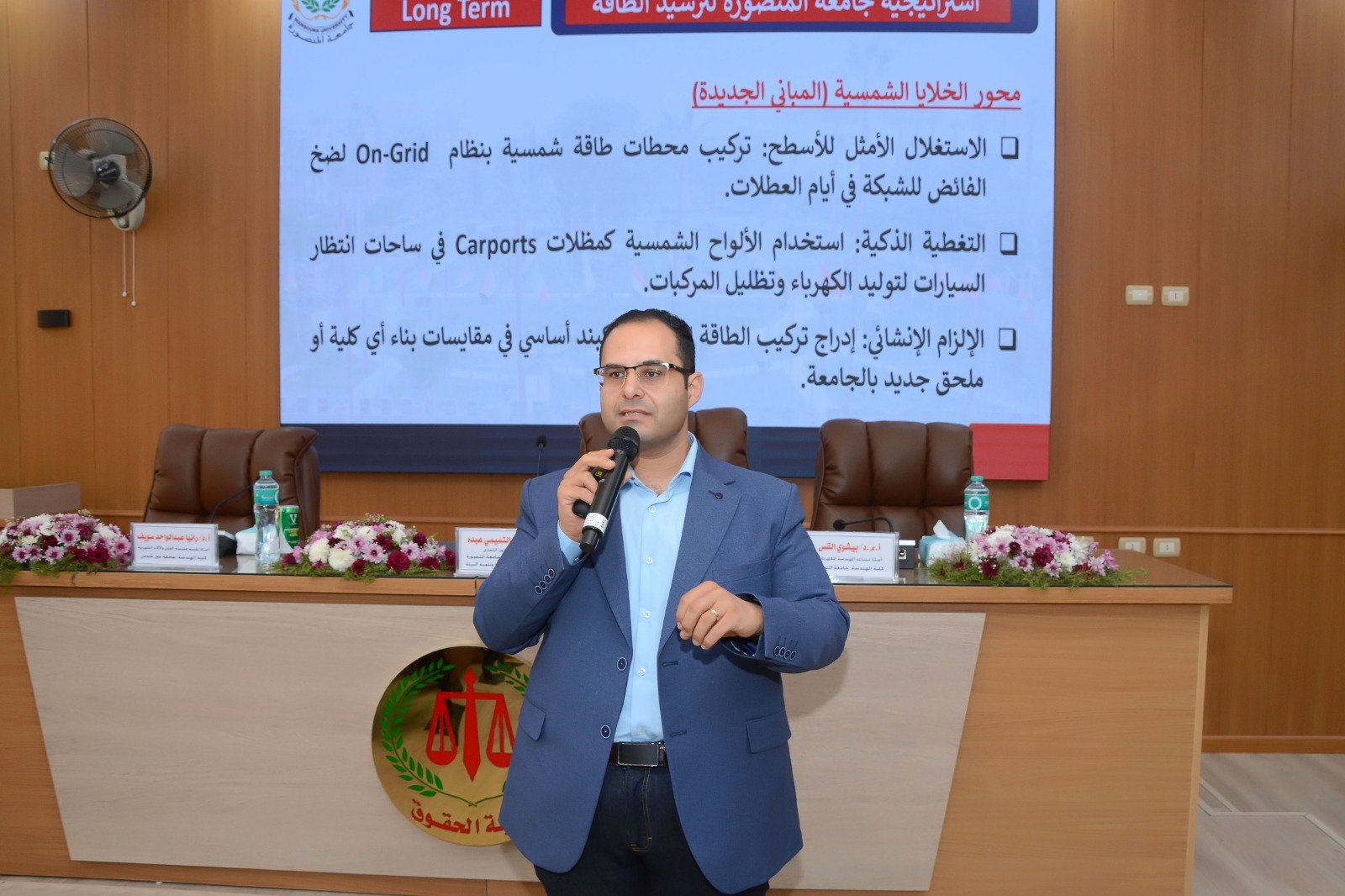من جانبه، استعرض الأستاذ الدكتور بيشوي القس سيدهم بشاي، مدير وحدة الطاقة بالجامعة، الملامح التنفيذية لاستراتيجية الجامعة بناءا على قرار رئيس جامعة المنصورة، موضحاً أن الخطة قصيرة الأمد تعتمد على حوكمة السلوك الاستهلاكي من خلال إجراءات فورية تشمل إطفاء الإضاءة الخارجية والطرقات فور انتهاء العمل الرسمي لخفض الاستهلاك المسائي بنسبة 70%، مع التوسع في استخدام الضوء الطبيعي نهاراً. وأشار د. بيشوي إلى قرار حظر استخدام الغلايات الكهربائية بكافة أنواعها، وضبط أجهزة التكييف عند درجة حرارة لا تقل عن 25 درجة مئوية بداية من يونيو 2026، مع التأكد من فصل التيار عن كافة المباني غير الحيوية بعد انتهاء مواعيد العمل، واعتماد سياسة مشتريات تقتصر على أجهزة الـ Inverter والمصابيح الموفرة، تحت رقابة دورية من وحدة الطاقة ووحدات السلامة والصحة المهنية.